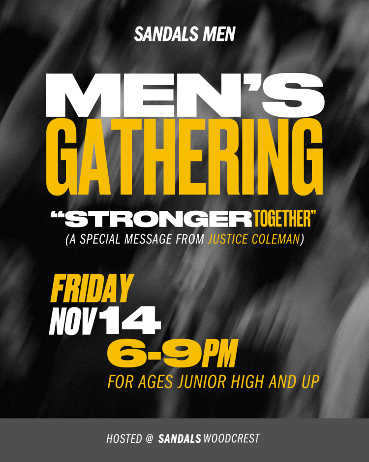 Sandals Church Men, join the guys for a night of fun, games, food and connection. We will be hearing a special word from our guest speaker, Justice Coleman. He’s a friend of Pastor Matt’s, leads a thriving church in L.A., has a passion for winning men to Jesus, and we are so excited to hear what he has for the men of our church!