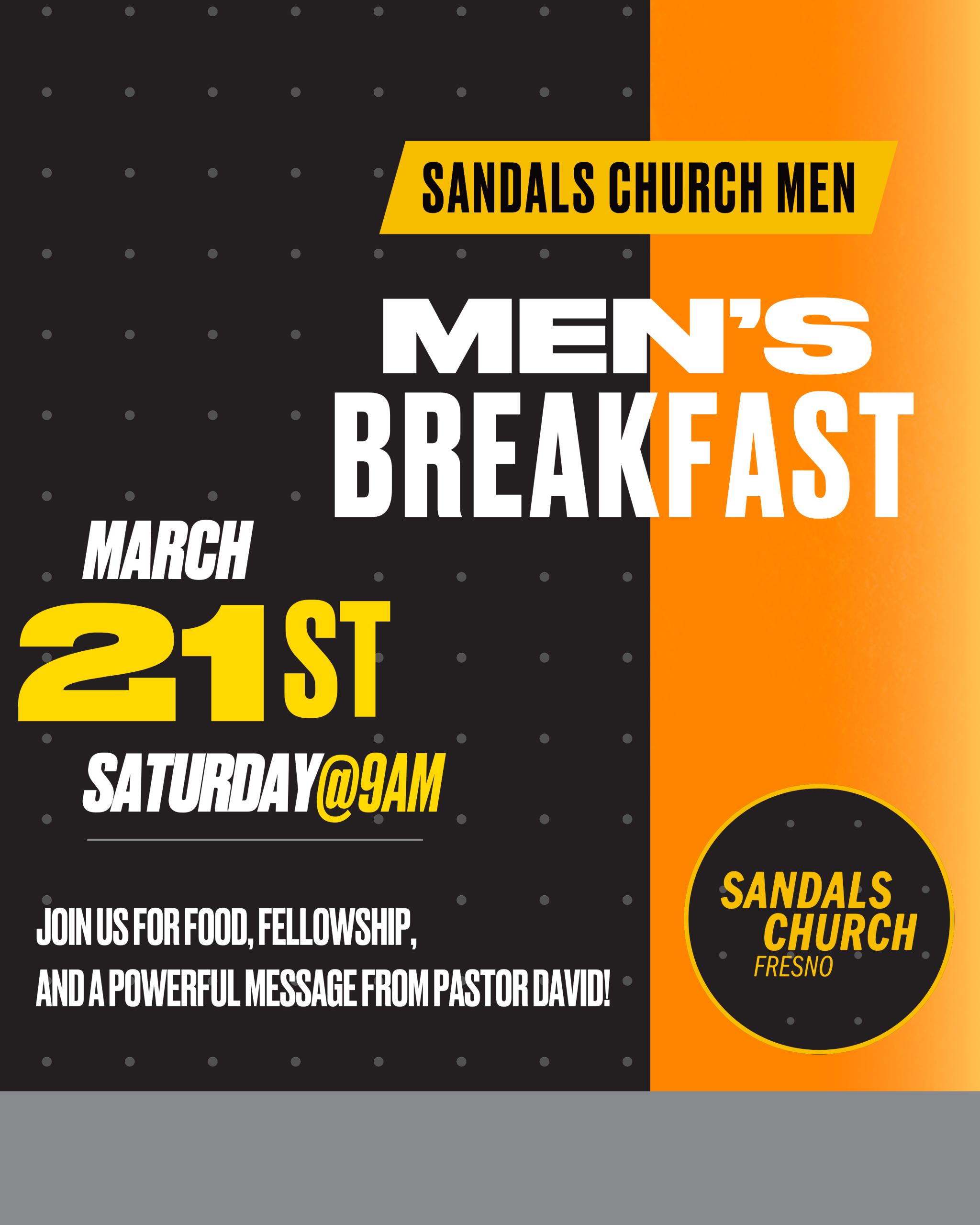 Sandals Church Men, Come to campus Saturday morning, March 21st at 9 am for some good food, great fellowship, and a powerful message from the Word of God! You won't want to miss it!