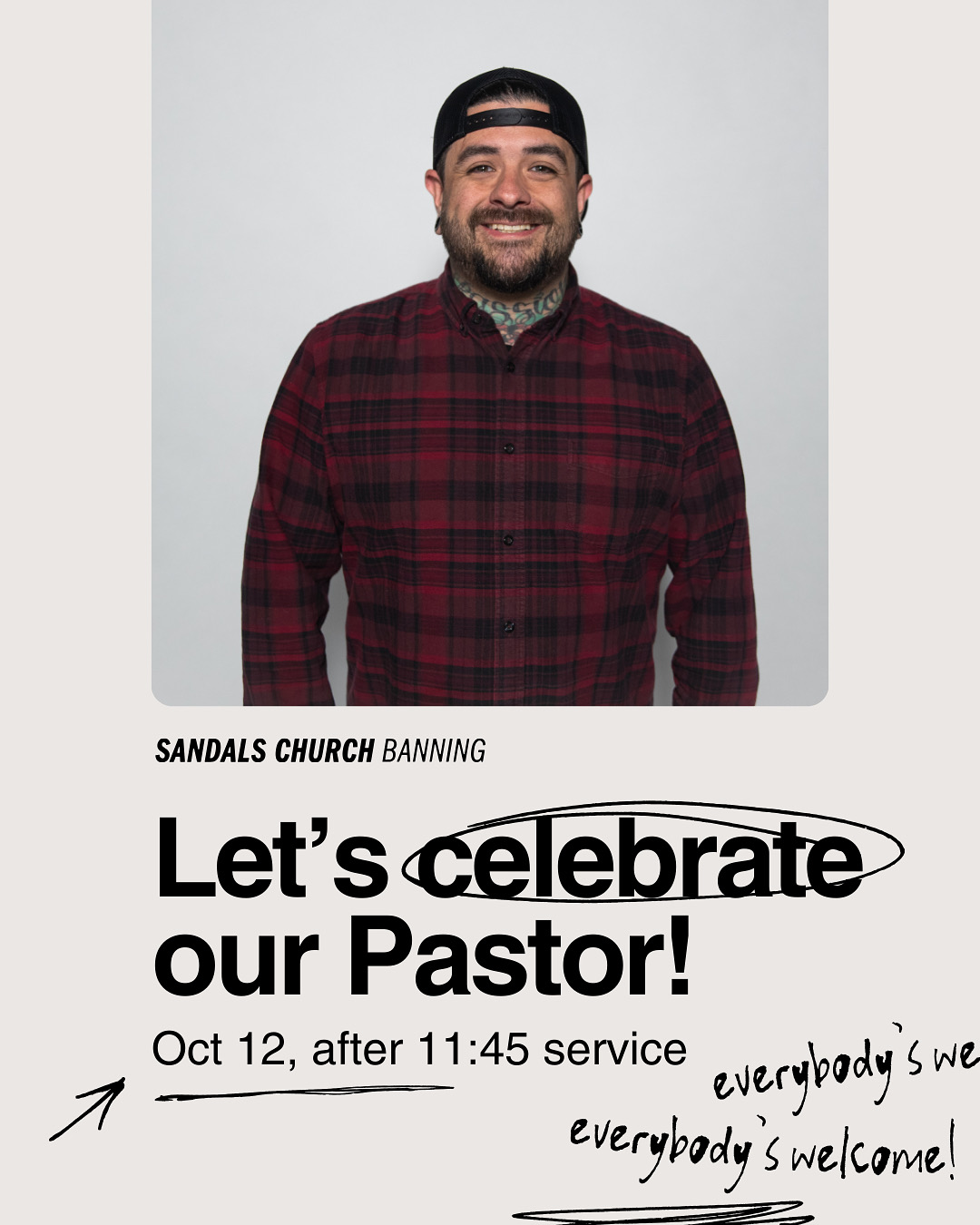 Pastor Appreciation Sunday – Oct. 12 This October, we’re celebrating Pastor John & Janna Martinez for the incredible way they love and lead our Sandals Church Banning family! Join us after 3rd service on Sunday, Oct. 12 for a burger BBQ. We’ll provide the burgers—you bring a side, chips, or dessert to share! 🍔🥗🍪 Whether […]