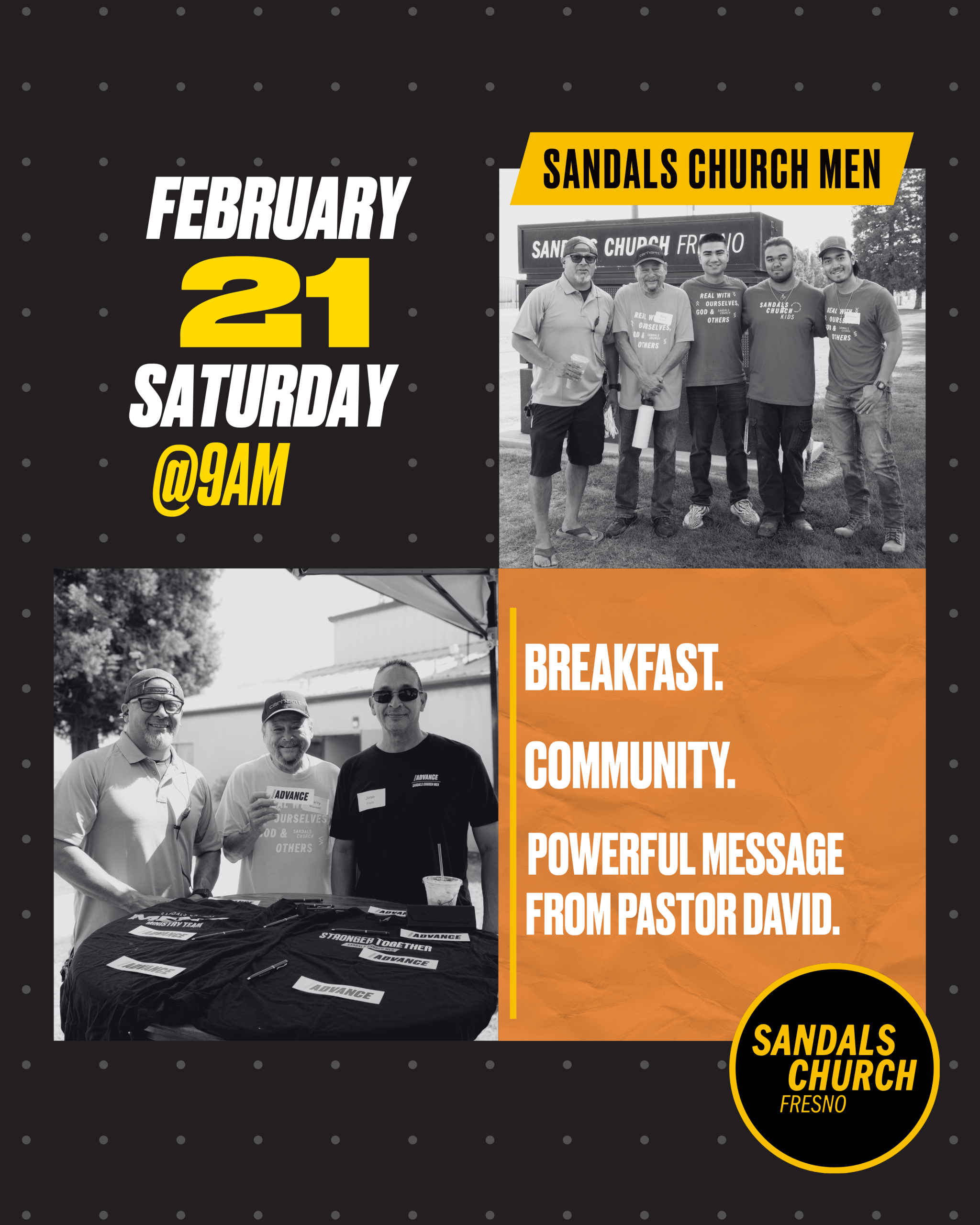 Attention Sandals Church Men! Come to campus Saturday morning, February 21st at 9 am for some good food, great fellowship, and a powerful message from the Word of God!